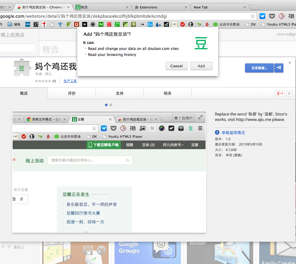 插件的地址在https://chrome.google.com/webstore/detail/妈个鸡还我豆油/dekpbaiaiekcofhjblkpbmbdeikcmdgi,鉴于伟大防火墙的存在,这个地址你不那啥是打不开的,所以我把它放在这里以供下载~